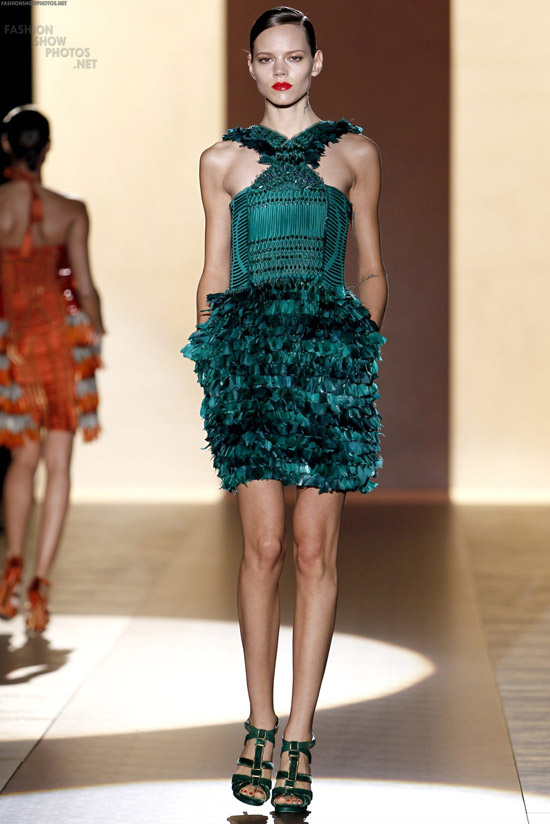 Gucci 2011 İlkbahar - Yaz Koleksiyonu - gucci tüylü zümrüt yeşili gece elbisesi modelleri