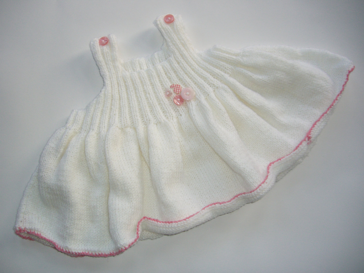 Beyaz yünden şişle örülen askılı bebek elbisesi modelinin arka kısmını ise aynı şekilde örün. Yalnızca askıların düğme ile birleştiğiyerde düğme deliğiaçmayın. düz örgü ve lastik örgüsündenördüğünüz askılı volanlı bebek elbisesi modelini terstendikin. daha sonra iğne iplikleveya tığla küçük bir kenar oyasıçekin. düğmelerle yaka çiçeği gibi süs yapıp örgümüzü sonlandıralım…