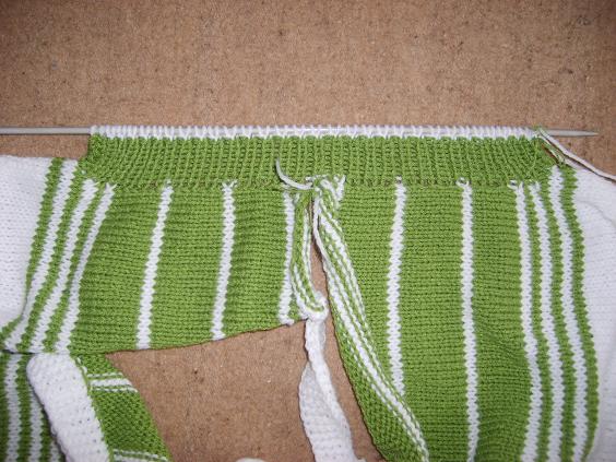 sonra yaka kesimine başladım.örgüyü tam ortadan ikiye ayırdıktan sonra,diğer tarafı bekletip,önce bir tarafını örüyoruz.yakayıda beraber öreceğim için,yaka olacak kısma altı ilmek attım.iki sırada bir,attığımız altı ilmeğin hemen yanındaki bir ilmeği kestim.resimde de görülüyor.istenen uzunluğa gelince omuzuda üç kerede keserek kapattım..omuzlar biraz eğimli olduğu için,keserken o eğimi vermek gerekiyor.