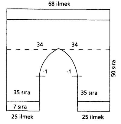 ÖN: örgümüze 25 ilmek atarak . yedi sıra pirinç örücez. Üzerine 35 sıra düz örgü örün. Sonraki sıra iç (ağ) taraftan, şiş üzerinde 34 ilmek oluncaya kadar 4 sırada 1 ilmek arttırarak örgüye devam edin. Son arttırma sırasından sonra örgüyü beklemeye alın. Aynı şekilde ikinci parçayı da örün ve beklemeye aldığınız parçayla birleştirerek 50 sıra düz örgü örün, şişten çıkarmayın. (64 ilmek)